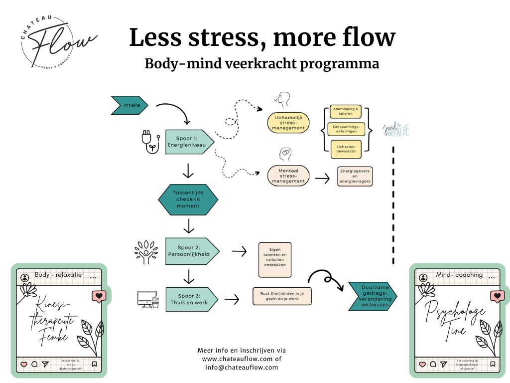 In ons holistisch body-mind programma ‘Less stress, more flow’ kijken we samen hoe het met je energie- & stressniveau gesteld is en nemen we zowel je thuis- als werksituatie onder de loep.